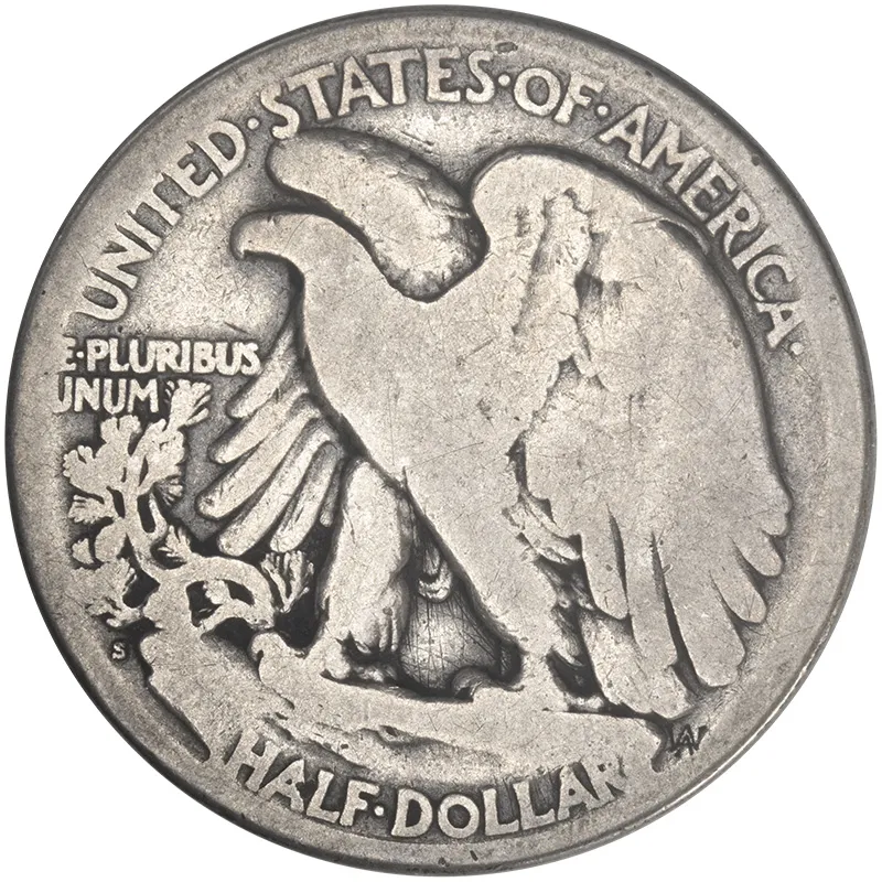 The Walking Liberty Half Dollar was first minted in 1916 with a side profile of Liberty walking toward the sun on the obverse and a perched eagle on the reverse.